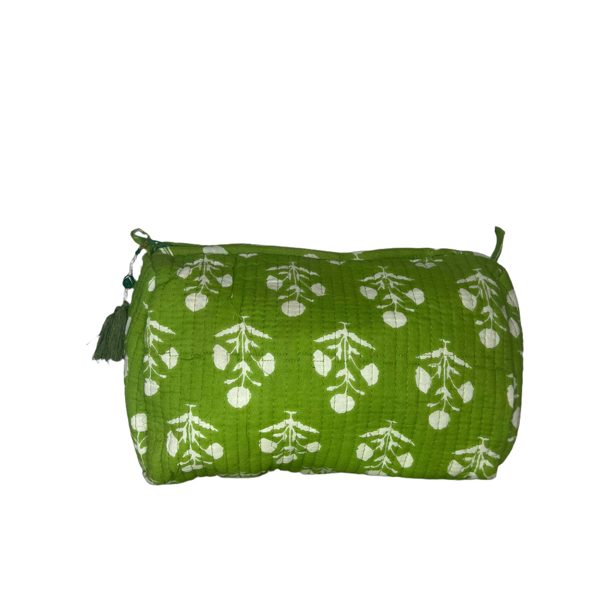 Blokprintet toilettaske med plastik for og indvendige lommer. Meget anvendelig til rejse eller brug som clutch.