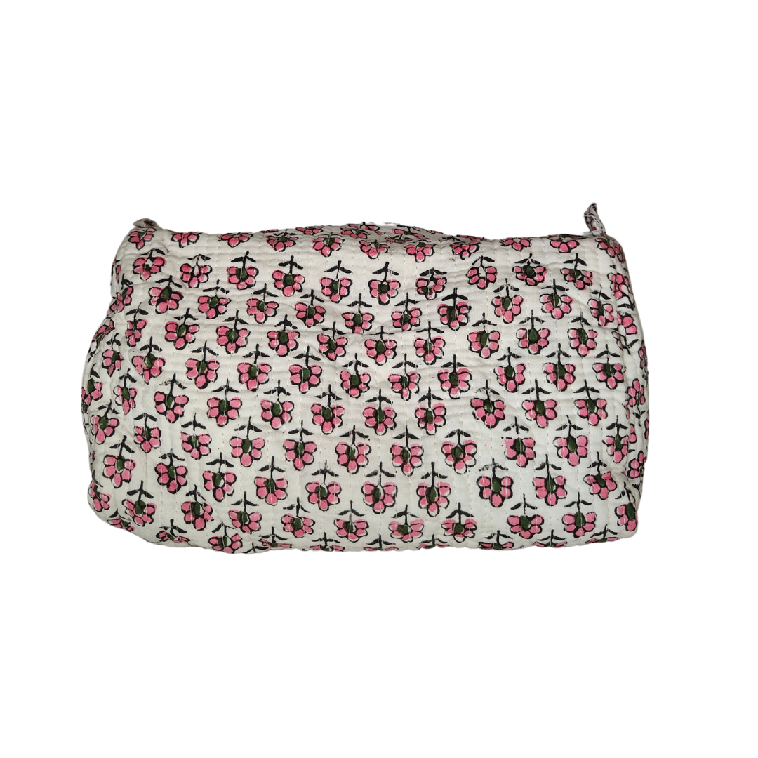 Blokprintet toilettaske med plastik for og indvendige lommer. Meget anvendelig til rejse eller brug som clutch.