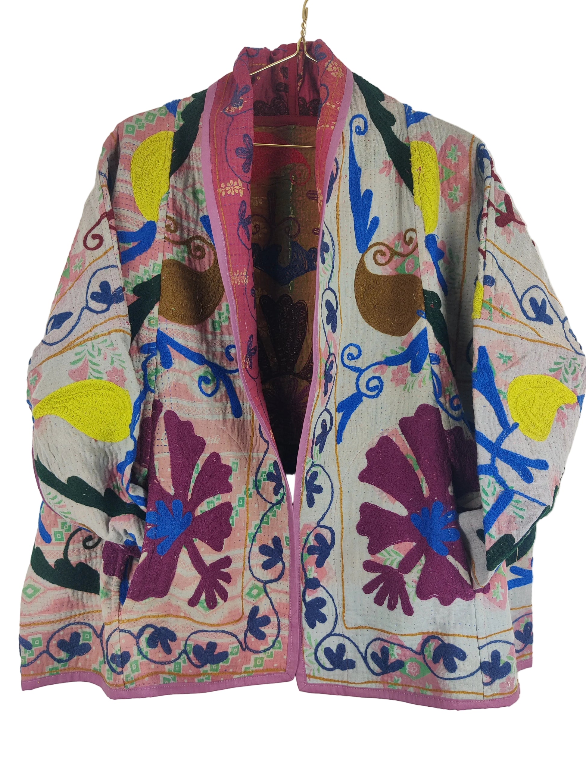 Kantha jakke med Suzani broderi er lavet ud af gamle kantha tæpper og broderet i hånden af Indiske håndværkere. Jakken kan derfor have noget patina med små uperfektheder.