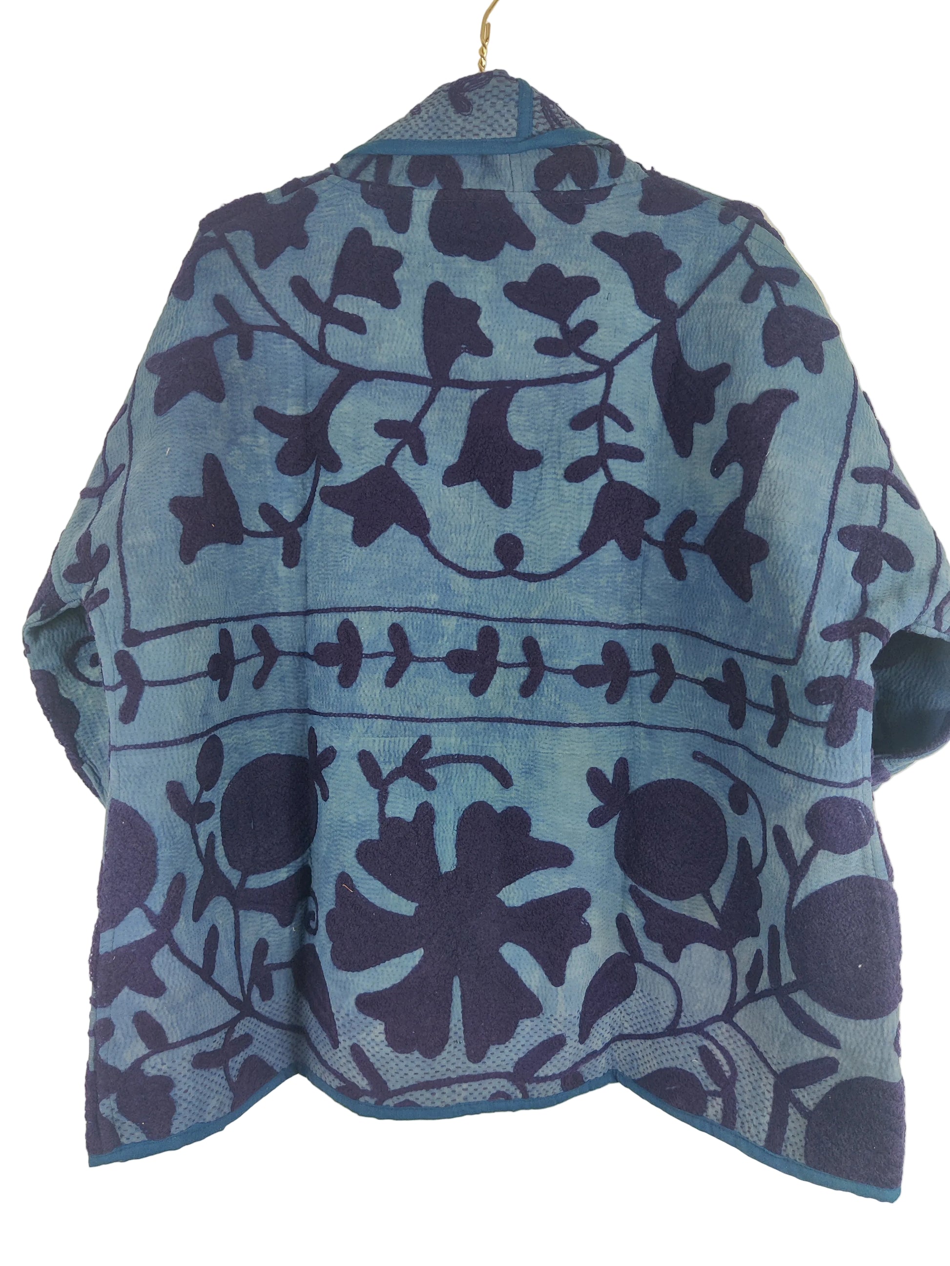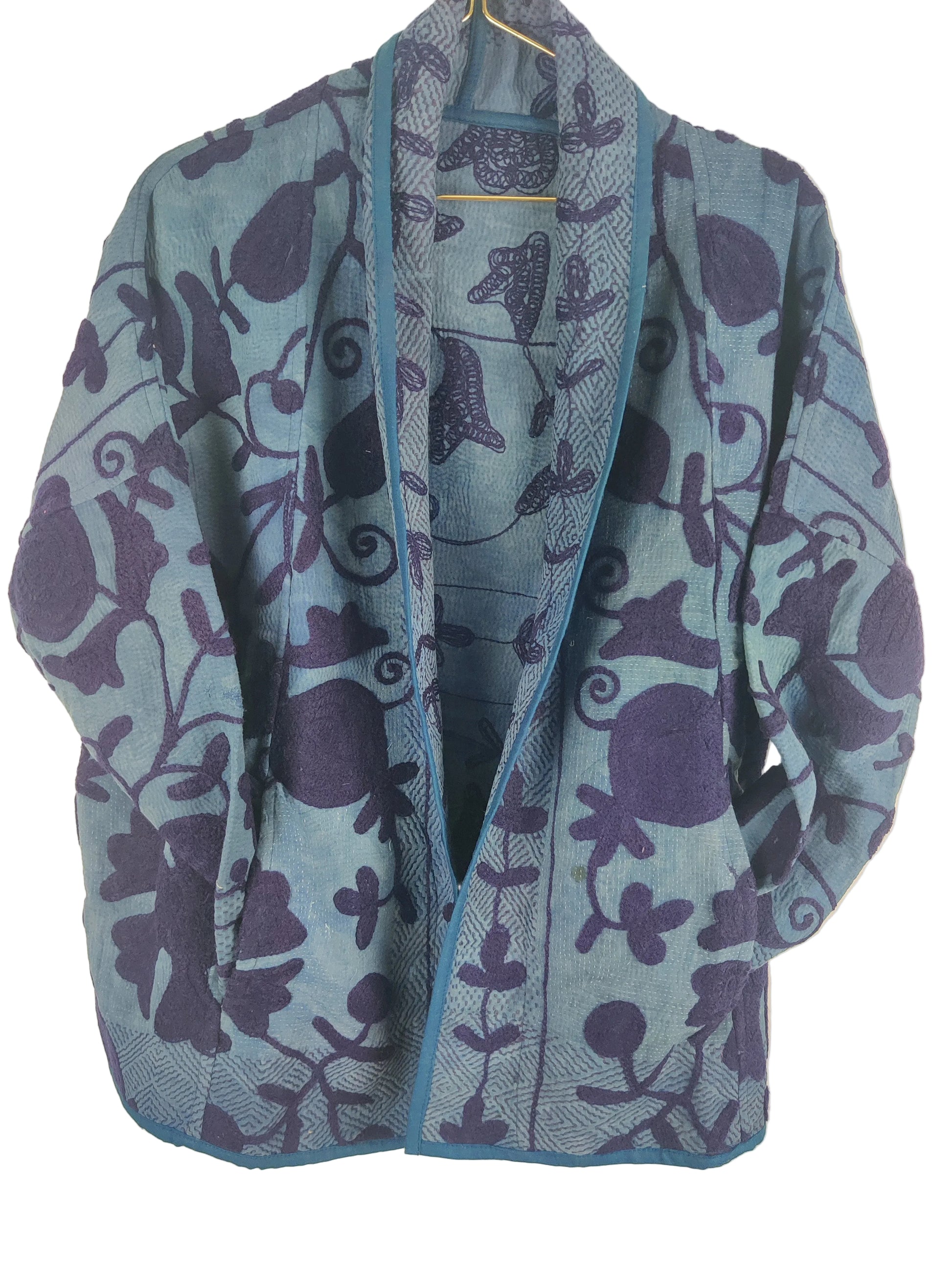 Kantha jakke med Suzani broderi er lavet ud af gamle kantha tæpper og broderet i hånden af Indiske håndværkere. Jakken kan derfor have noget patina med små uperfektheder.