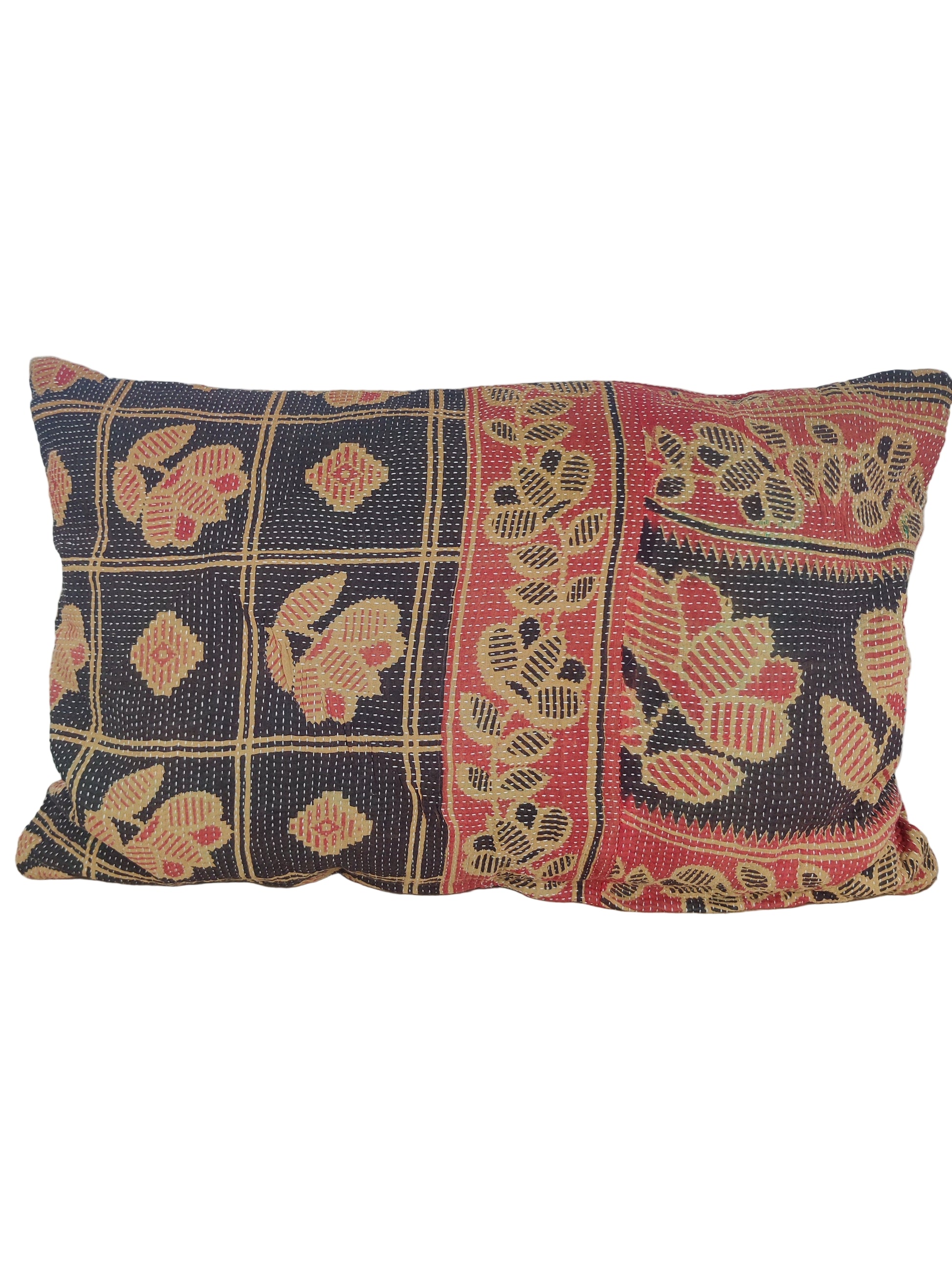 Forkæl dit hjem med vores vintage sari kantha puder – der emmer af karakter og historie. Disse puder er ikke bare dekorative; de er en rejse gennem tid og kultur.  Hver pude er unik og skabt med omhu og opmærksomhed på detaljerne, og samtidig med fokus på at bevare den autentiske charme fra vintage Kantha tæpper. Dermed kan der også forekomme diskrete brugsspor og charmerende smålapper, som er særligt udvalgt til formålet. Kantha-broderiteknikken, som er anvendt med kreativt flair, genopliver de gamle bomuldssarier og transformerer dem til en ny form af skønhed,  og dermed en høj grad af genbrug og bæredygtighed. Den traditionelle kantha-broderiteknik, med dens karakteristiske rækker af korte, sammenhængende sting syet i hånden, fortæller historien om indiske kvinder på landet, der har praktiseret denne kunst i århundreder. Hver pude er et unikt kunstværk med sin egen mønster- og farvekombination, hvilket gør den til en helt særlig tilføjelse til dit hjem. Kantha puder bærer sjælen af tradition og håndværk. Alle puder inkl. pudefyld i mix.