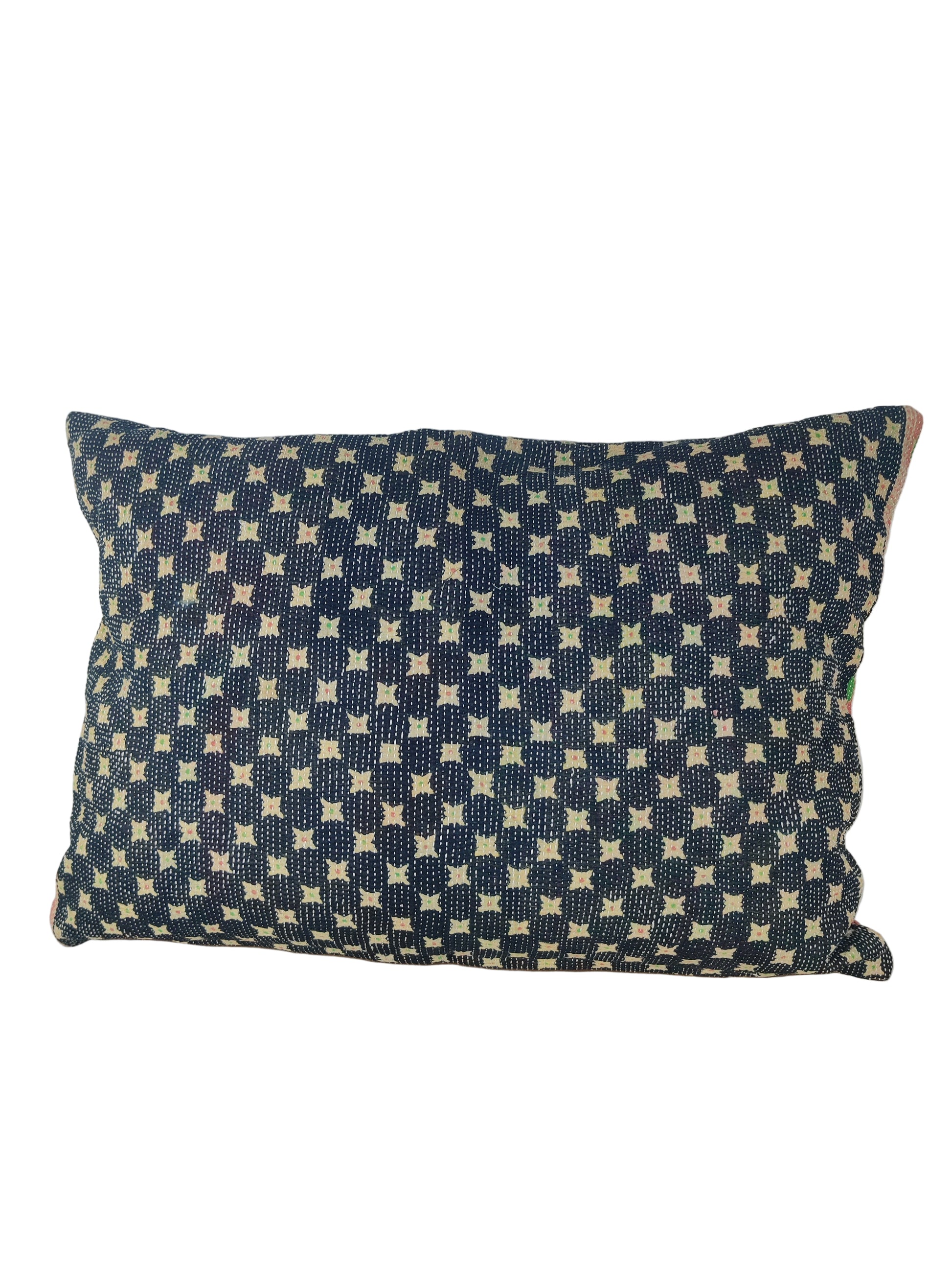 Forkæl dit hjem med vores vintage sari kantha puder – der emmer af karakter og historie. Disse puder er ikke bare dekorative; de er en rejse gennem tid og kultur.  Hver pude er unik og skabt med omhu og opmærksomhed på detaljerne, og samtidig med fokus på at bevare den autentiske charme fra vintage Kantha tæpper. Dermed kan der også forekomme diskrete brugsspor og charmerende smålapper, som er særligt udvalgt til formålet. Kantha-broderiteknikken, som er anvendt med kreativt flair, genopliver de gamle bomuldssarier og transformerer dem til en ny form af skønhed,  og dermed en høj grad af genbrug og bæredygtighed. Den traditionelle kantha-broderiteknik, med dens karakteristiske rækker af korte, sammenhængende sting syet i hånden, fortæller historien om indiske kvinder på landet, der har praktiseret denne kunst i århundreder. Hver pude er et unikt kunstværk med sin egen mønster- og farvekombination, hvilket gør den til en helt særlig tilføjelse til dit hjem. Kantha puder bærer sjælen af tradition og håndværk. Alle puder inkl. pudefyld i mix.
