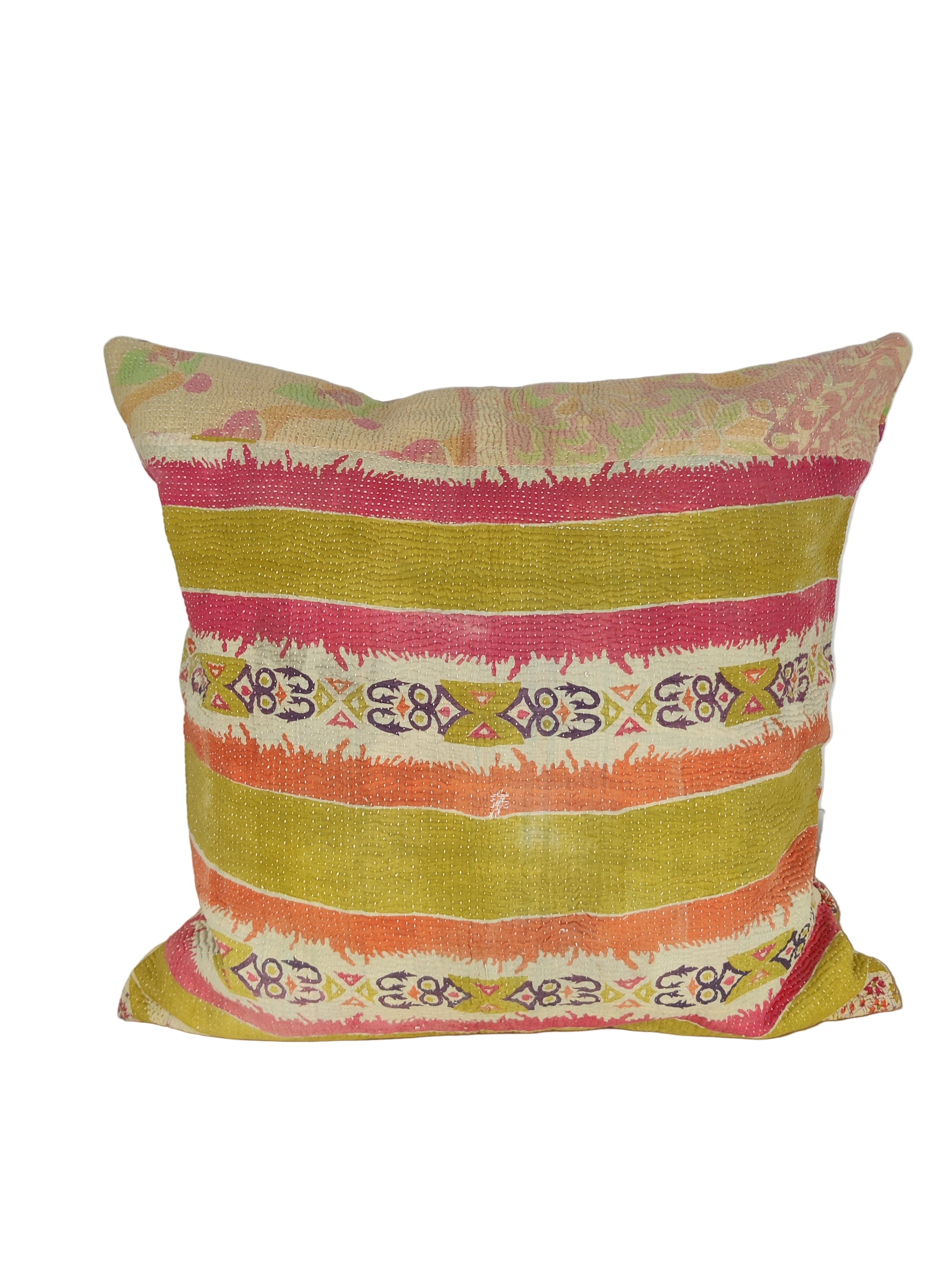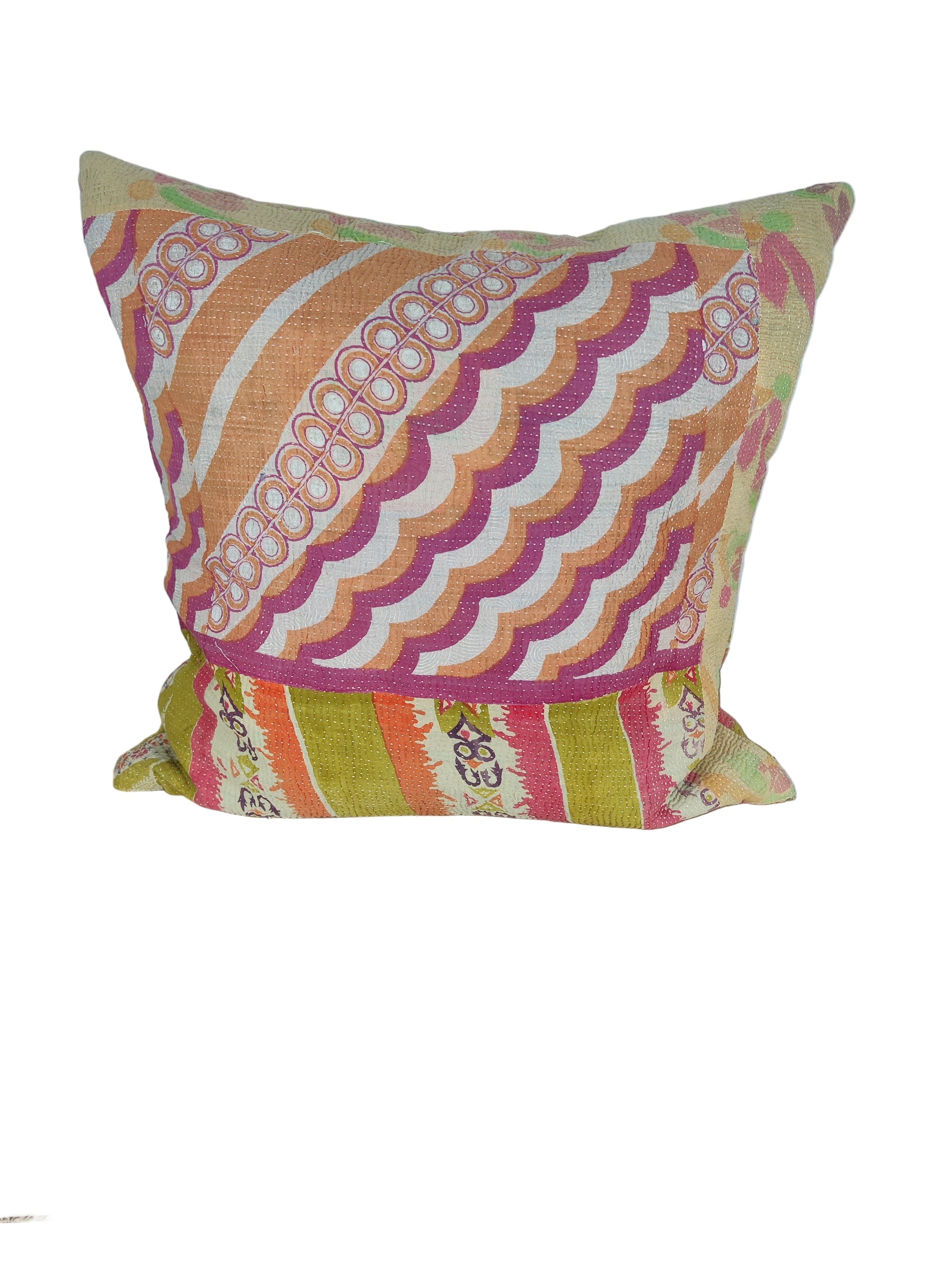 Forkæl dit hjem med vores vintage sari kantha puder – der emmer af karakter og historie. Disse puder er ikke bare dekorative; de er en rejse gennem tid og kultur.  Hver pude er unik og skabt med omhu og opmærksomhed på detaljerne, og samtidig med fokus på at bevare den autentiske charme fra vintage Kantha tæpper. Dermed kan der også forekomme diskrete brugsspor og charmerende smålapper, som er særligt udvalgt til formålet. Kantha-broderiteknikken, som er anvendt med kreativt flair, genopliver de gamle bomuldssarier og transformerer dem til en ny form af skønhed,  og dermed en høj grad af genbrug og bæredygtighed. Den traditionelle kantha-broderiteknik, med dens karakteristiske rækker af korte, sammenhængende sting syet i hånden, fortæller historien om indiske kvinder på landet, der har praktiseret denne kunst i århundreder. Hver pude er et unikt kunstværk med sin egen mønster- og farvekombination, hvilket gør den til en helt særlig tilføjelse til dit hjem. Kantha puder bærer sjælen af tradition og håndværk. Alle puder inkl. pudefyld i mix.