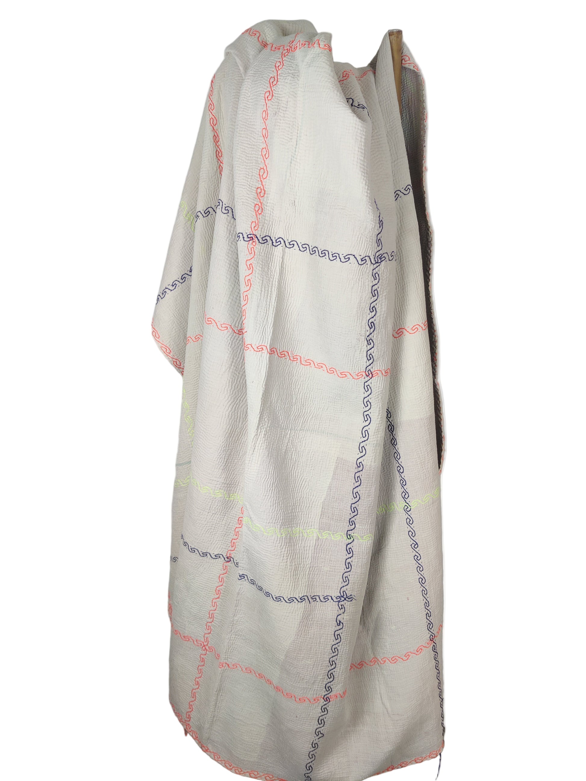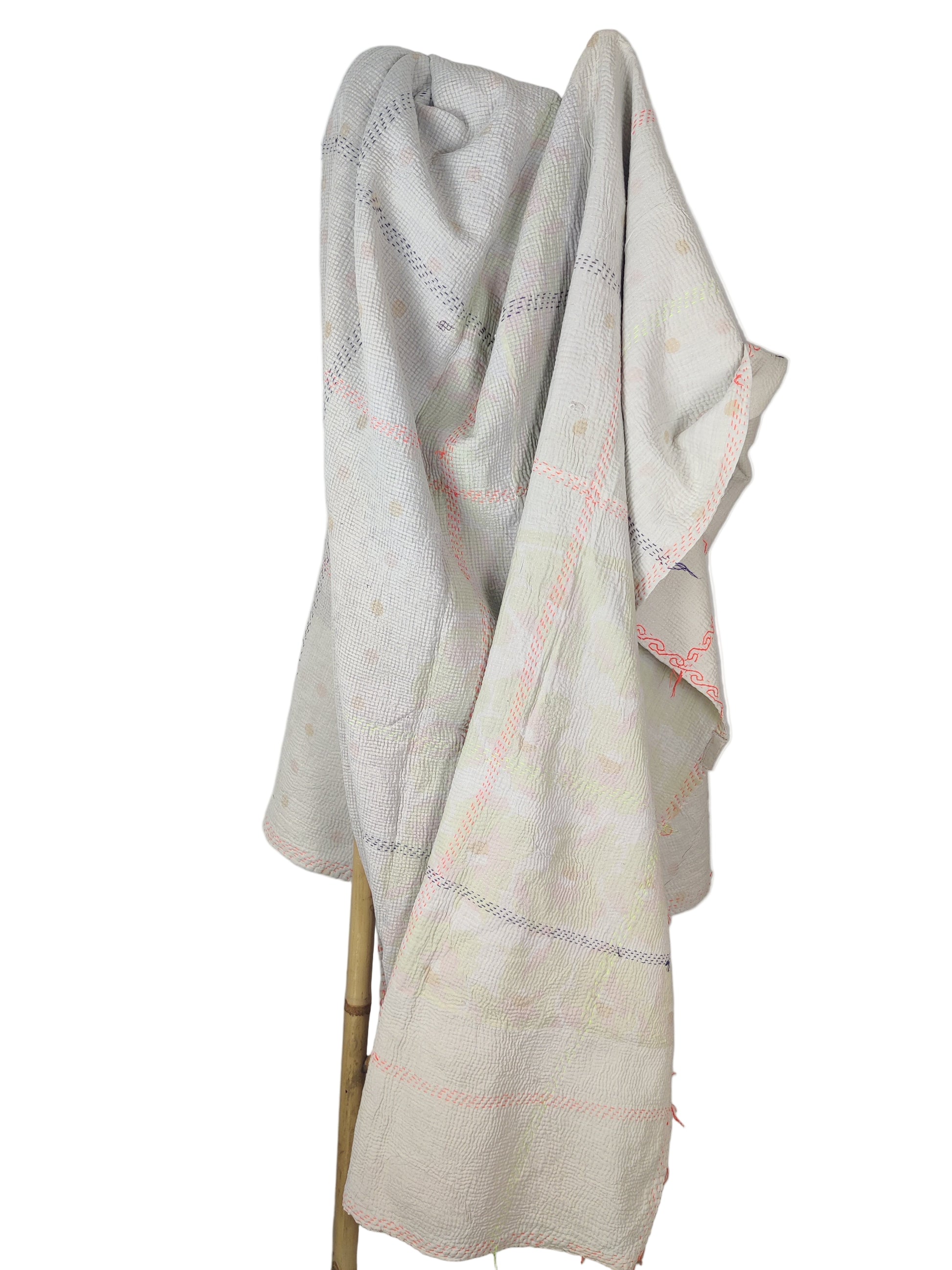 Disse skønne unika tæpper er syet af genanvendte sarier De aflagte sarier sys sammen i flere lag og quiltes med de særlige kantha sting. Da stoffet er genbrugt kan der forekomme pletter, slid og små finurlige lapper. Dette er en del af charmen.